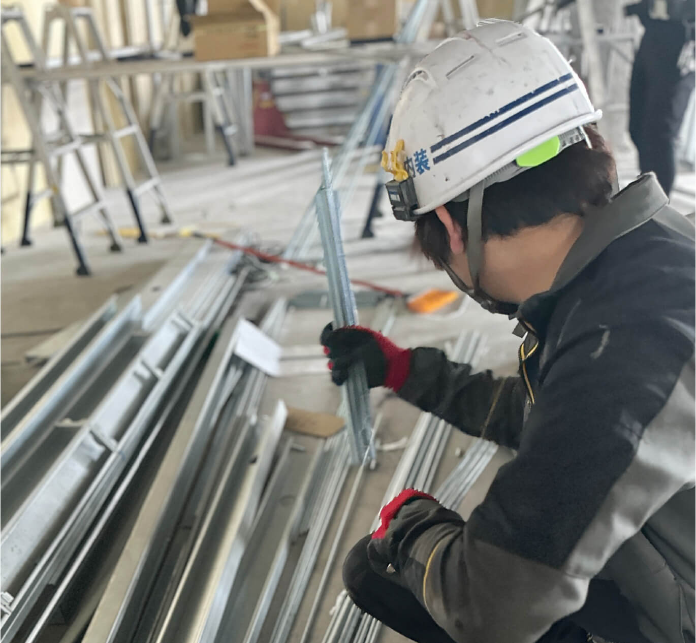 内装の骨組みとなる軽量鉄骨の取り付け、床や天井、壁のボード工事、クロスの張り替えなど、建物の内側にあたる部分を施工する「内装工事」を幅広く行います。